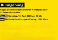 Eine polizeilich angemeldete Kundgebung von Umweltinitiativen, Wissenschaftern und Künstlern. Ihr Protest richtet sich gegen den geplanten Baubeginn des ersten Teilstückes der Autobahn sowie gegen Naturzerstörung, Bodenversiegelung und veraltete Verkehrspolitik. Die Regierungsparteien halten am Baubeginn dieses Abschnittes der S1 im Frühjahr 2026 fest, obwohl mehrere Verfahren – allen voran jenes beim Europäischen Gerichtshof zum Lobau-Tunnel – noch anhängig sind. Solange diese nicht juristisch entschieden sind, droht der erste Abschnitt von Süßenbrunn nach Groß Enzersdorf zu einer…