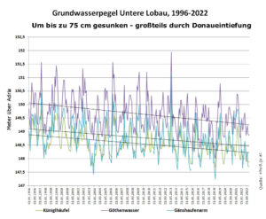 Die Entwicklung beeinträchtigt natürlich alle Grundwassernutzungen entlang der Donau. Die wichtigste davon ist zweifellos das Grundwasserwerk Lobau in der Unteren Lobau. Hier ist der Grundwasserspiegel an donaunahen Messstellen (Göthenwasser, Gänshaufenarm), aber auch in weiterer Entfernung von der Donau (Küniglhäufel) zwischen 1996 und 2022 um bis zu 75 cm gefallen (siehe Grafik, Trendlinien). Im Zeitraum bis 2020 waren es beim Göthenwasser 65 cm, rund zwei Drittel davon oder 40 cm waren auf die Sohleintiefung zurückzuführen, der Rest auf die rückläufige Wasserführung der Donau (siehe Tabelle oben).