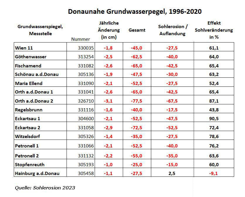 Die donaunahen Grundwasserpegel sind zwischen 1996 und 2020 fast überall entlang der Gesamtstrecke stark abgesunken. Diese Absenkungen nehmen zwar in der Regel mit der Entfernung zur Donau ab, erstrecken sich aber auf große Teile des Nationalparks und lokal auch darüber hinaus. Die Grundwasserpegel werden sowohl von der Wasserführung als auch von der Sohleintiefung beeinflusst. Der Anteil der Sohleintiefung ist in der nachstehenden Tabelle (Daten: Sohlerosion 2023) separat angegeben. Die stärksten Absenkungen durch die Sohleintiefung sind an Pegelstellen in der Unteren Lobau, Fischamend, Orth und Eckartsau zu beobachten. Der Effekt der Sohleintiefung erreicht selbst in 3 km Entfernung (Eckartsau 1) noch ein Ausmaß von 47,5 cm (von 52,5 cm gesamt).