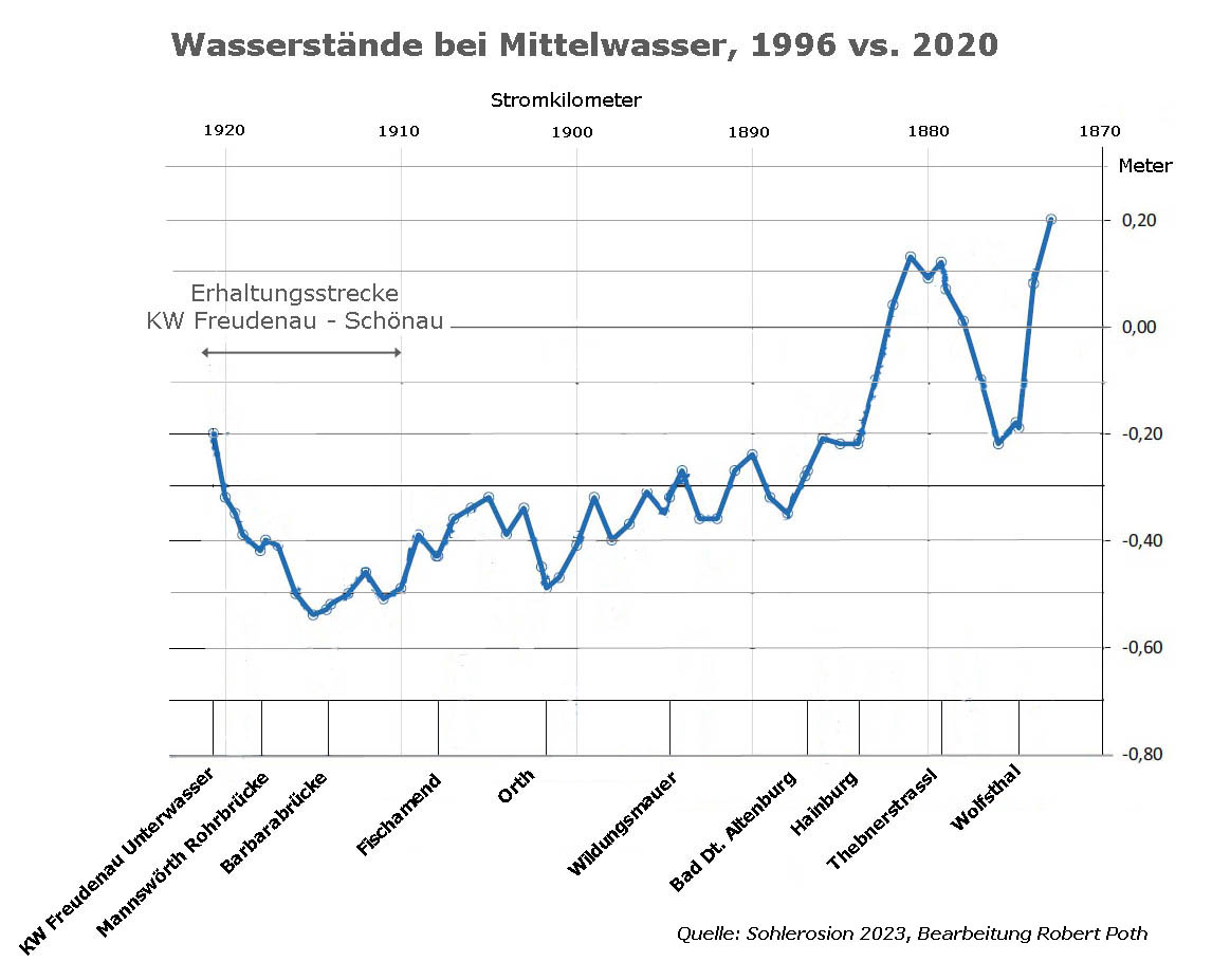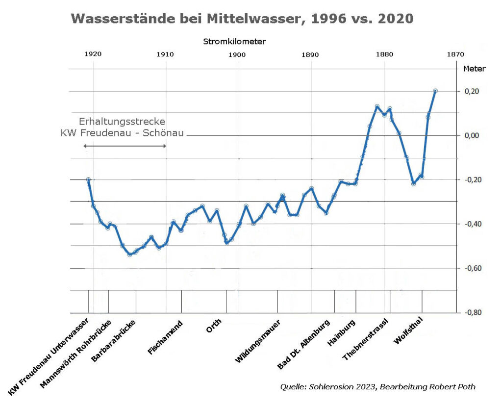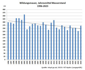 Die Pegeländerungen der Donau entsprechen der Gesamtauswirkung von Sohleintiefung und rückläufiger Wasserführung. In manchen Donauabschnitten könnte sich die rückläufige Wasserführung sogar stärker ausgewirkt haben als die Sohleintiefung, etwa in Wildungsmauer. Dort sanken die Pegelstände (Jahresmittel) zwischen 1996 und 2023 um ca. 70 cm (Grafik rechts), wozu die Sohleintiefung (bis 2020) etwa 32 cm beigetragen haben dürfte [Sohlerosion 2023].