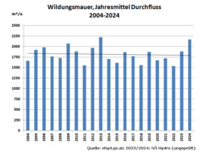 Ein anhaltender Abwärtstrend der Wasserführung, zumal in der bisherigen Stärke, wäre langfristig natürlich fatal für den Nationalpark Donau-Auen, ob auf den Klimawandel zurückzuführen oder nicht. Die Daten lassen aber auch eine optimistischere Sicht zu: Von 2004 bis 2024, immerhin ein Zeitraum von 21 Jahren, geht die Wasserführung zumindest in Wildungsmauer nur mehr leicht zurück. Nimmt man das (trockene) Jahr 2003 hinzu, ergibt sich sogar ein geringfügiger Anstieg.
