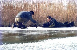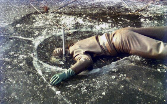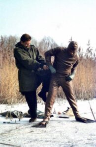 Als sie am westlichen Ende des Lausgrundwassers, praktischerweise fast unmittelbar beim Hubertusdamm gelegen, angekommen waren, erwartete sie eine dicke Eisschicht, die erst mühsam aufgehackt werden musste. Danach zwängte sich Peter Appelius mit Charlie Fialas Hilfe in den Gummianzug. Norbert Sendor hielt die Szene mit seinem Fotoapparat fest.